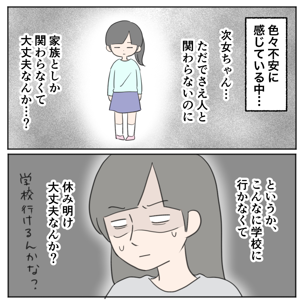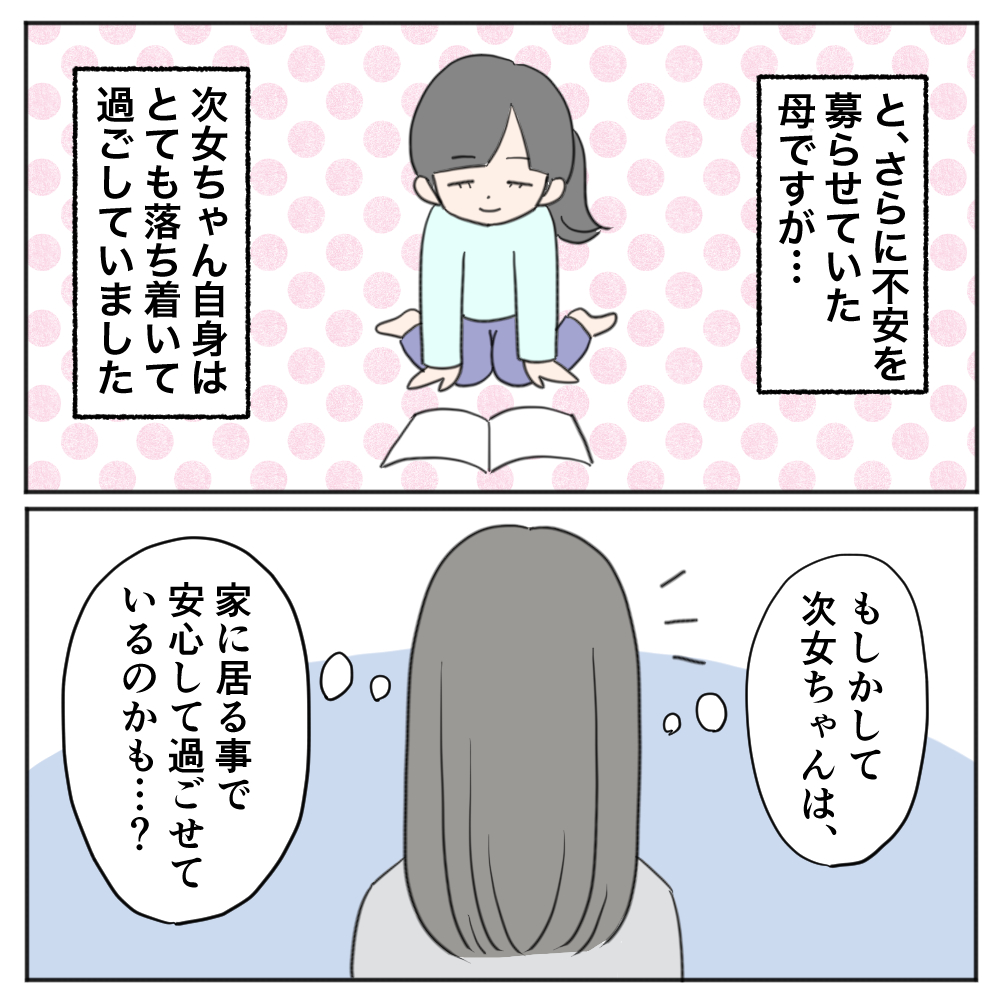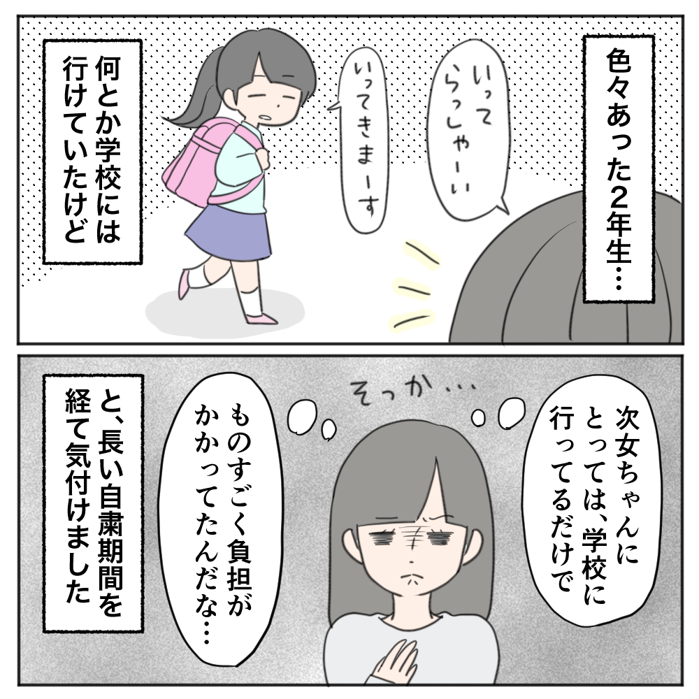 長女はストレスをためていた部分もあったけど、次女に関しては学校に行かないで家で落ち着いて過ごしていて、それまで学校に行ってるだけでものすごいエネルギーを使っていたんだな~と気づくことができました。