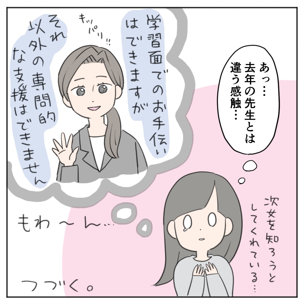 面談の続きは、引継ぎが無かったことでちょっと荒れ気味だった私の心でしたが、先生との話の中で「アレ…?去年の先生とは違うかも…?」と少し希望が見えてきたのでした!