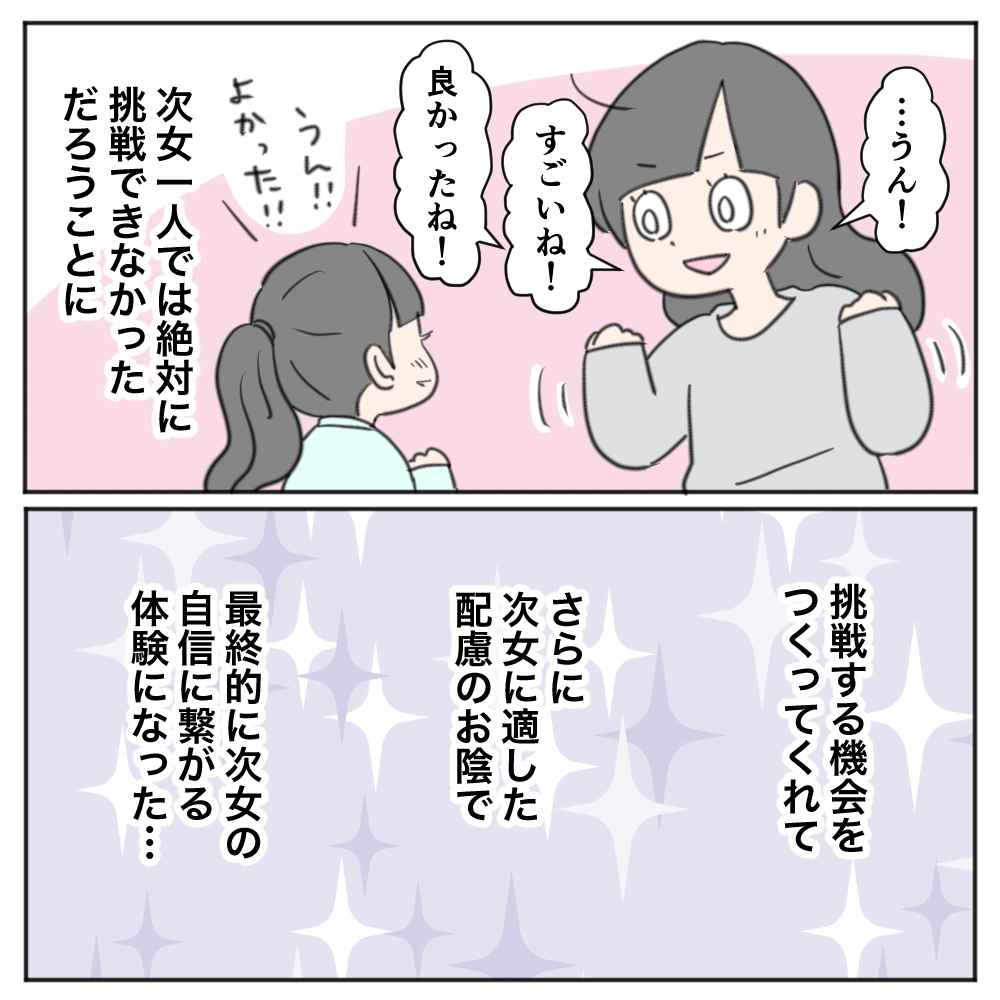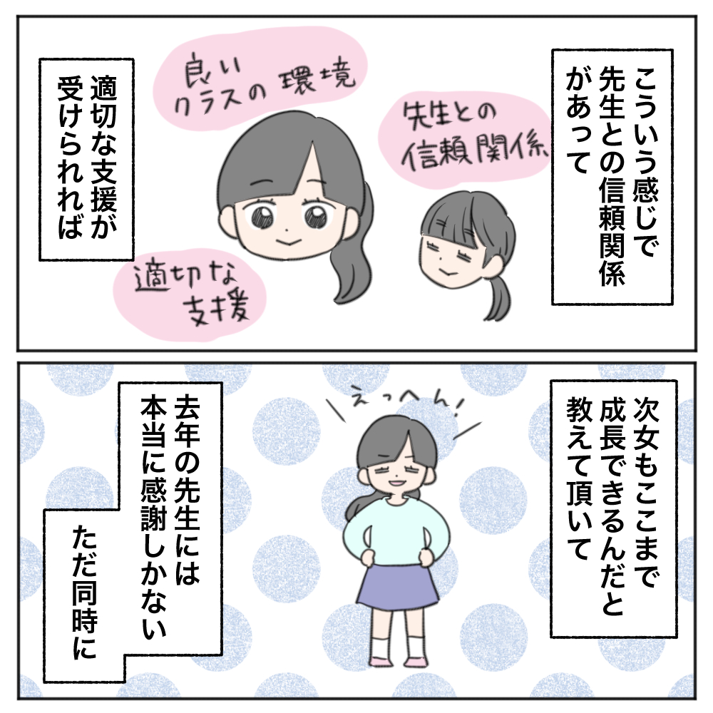 実際私の方には、私の足りないところがあれば「なんで次女ちゃんのためにこういう風にしなかったのですか・こうするべきです」というメッセージが来て、逆に先生に配慮をお願いすると「求めすぎ」「先生に配慮して」という感じのメッセージがきたりします。