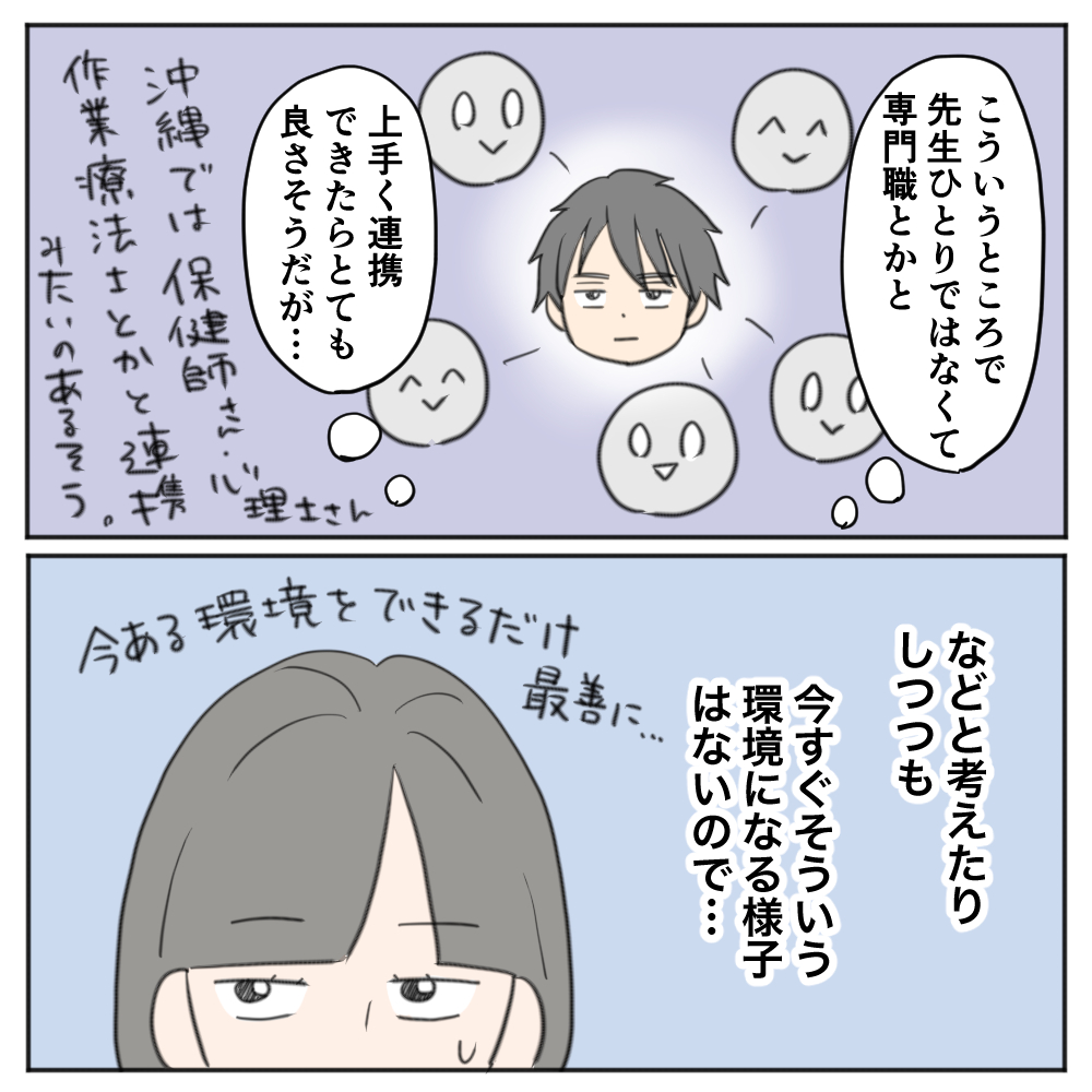 漫画の途中に書いてある、沖縄での保健士さん・心理士さん・作業療法士と学校の連携については、作業療法士(OT)である仲間知穂さんが書いた「学校に作業療法を」という本の中に出てきます。