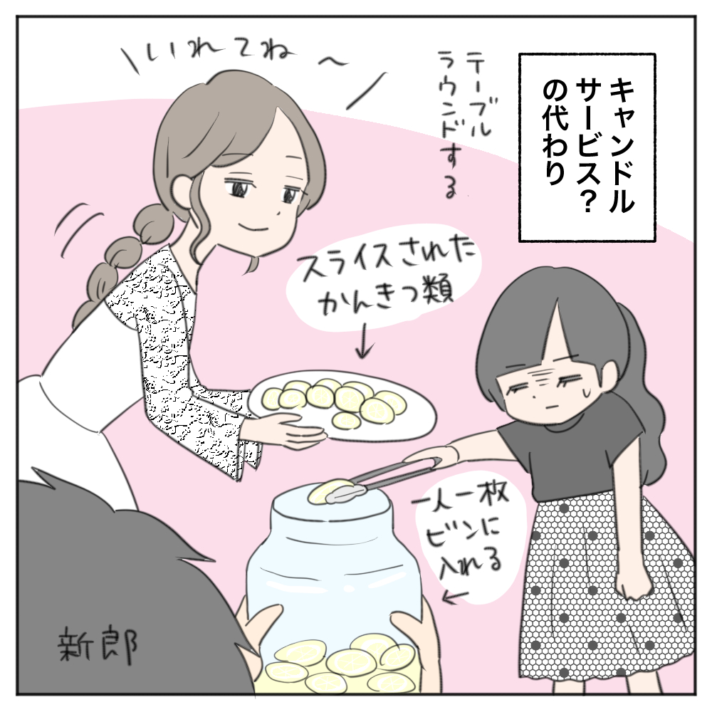 さらに今は、テーブルをまわってキャンドルサービスをするんじゃなくて、瓶に柑橘類のスライスを入れて、そこにお酒を入れて果実酒?にして、友人たちとまた集まる機会を作る…みたいなこととかするんですね。