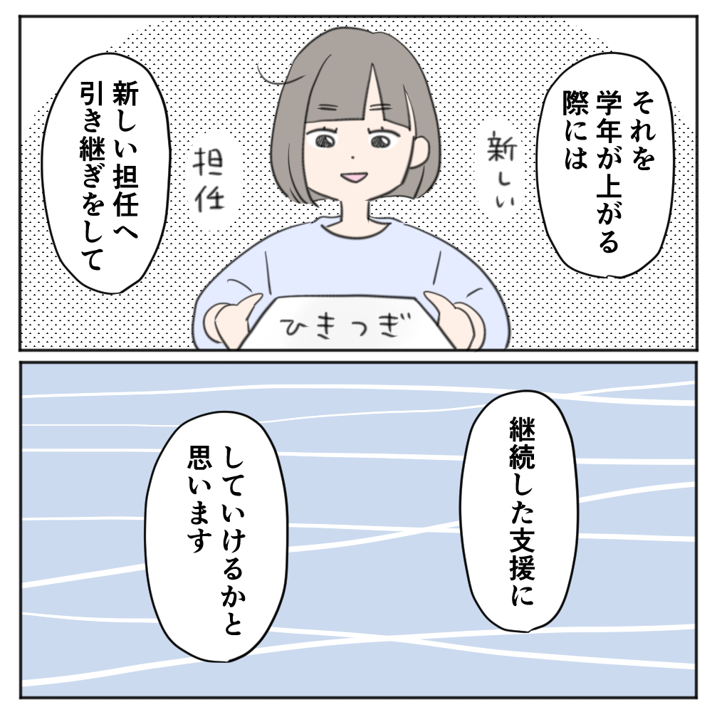 昨年、3年生編の話を描いていた時に、進級時の引継ぎが無かったお話を描いたら、同じ体験をされた方や、「ありえない!」と言ってくれる教職の方が多かったのですが、これでやっと引継ぎの心配少なく進級することができるようになりました…!