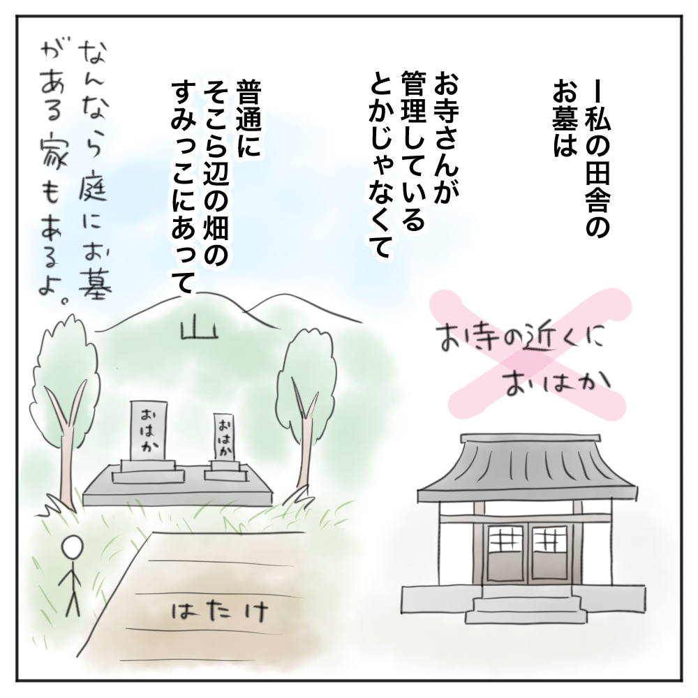 田舎は、家とお墓の距離が近くて、我が家も家から徒歩3分くらいの畑のすみっこにあってすぐにお墓参りに行けます。