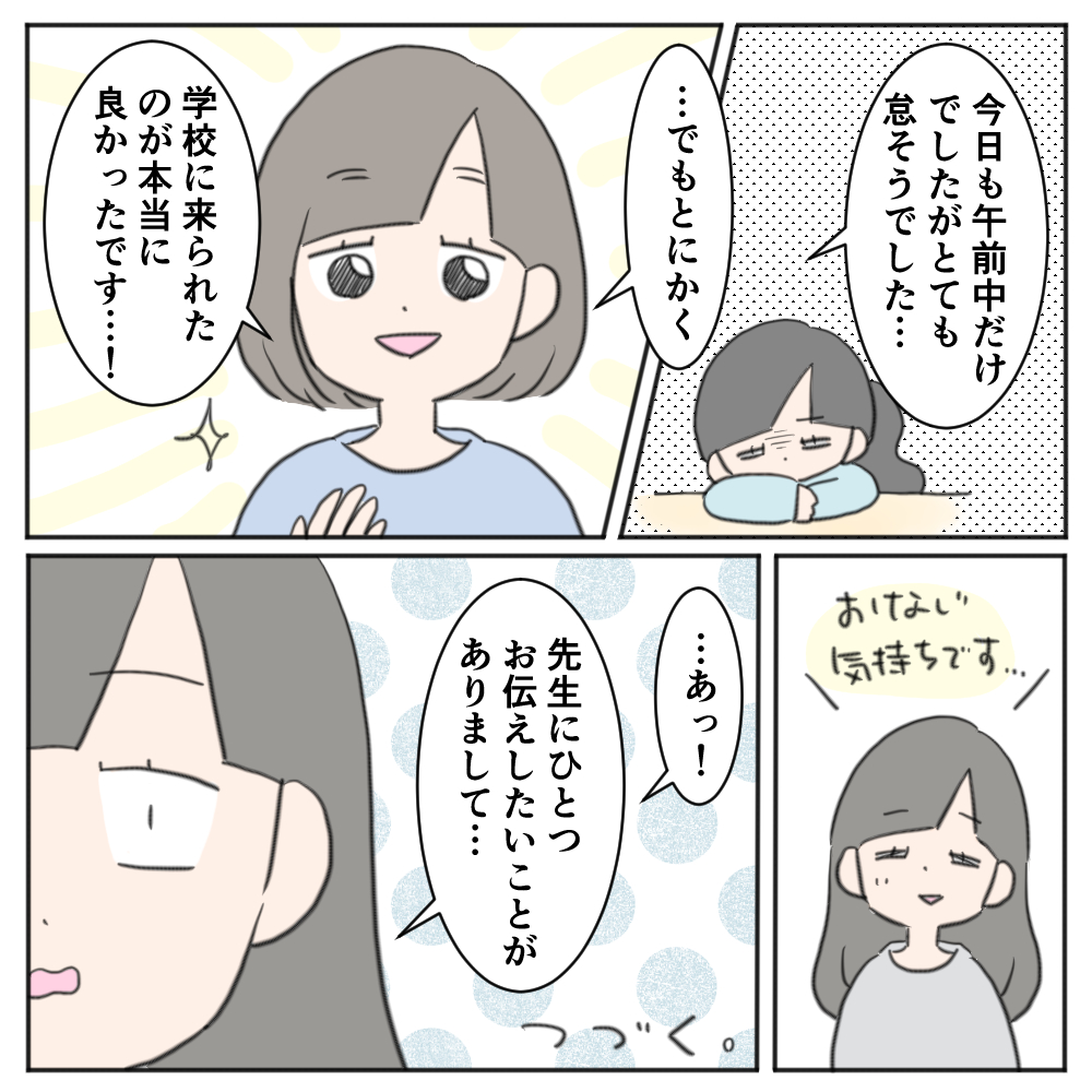 久しぶりの学校で先生とお話して、次女が学校に行けたことを同じ気持ちで喜んでくれたことが嬉しかったです☺