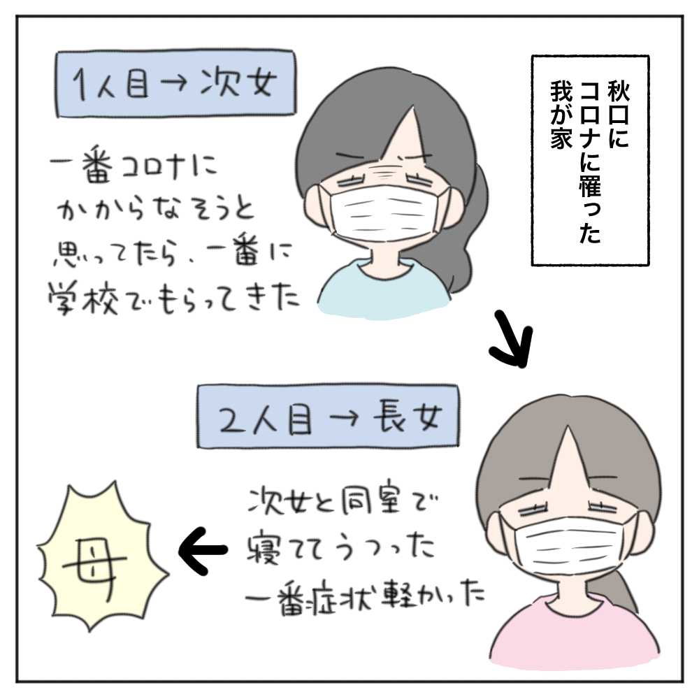 今年の秋頃に、次女→長女→私の順番で初めてコロナにかかりました(夫だけ無事)。