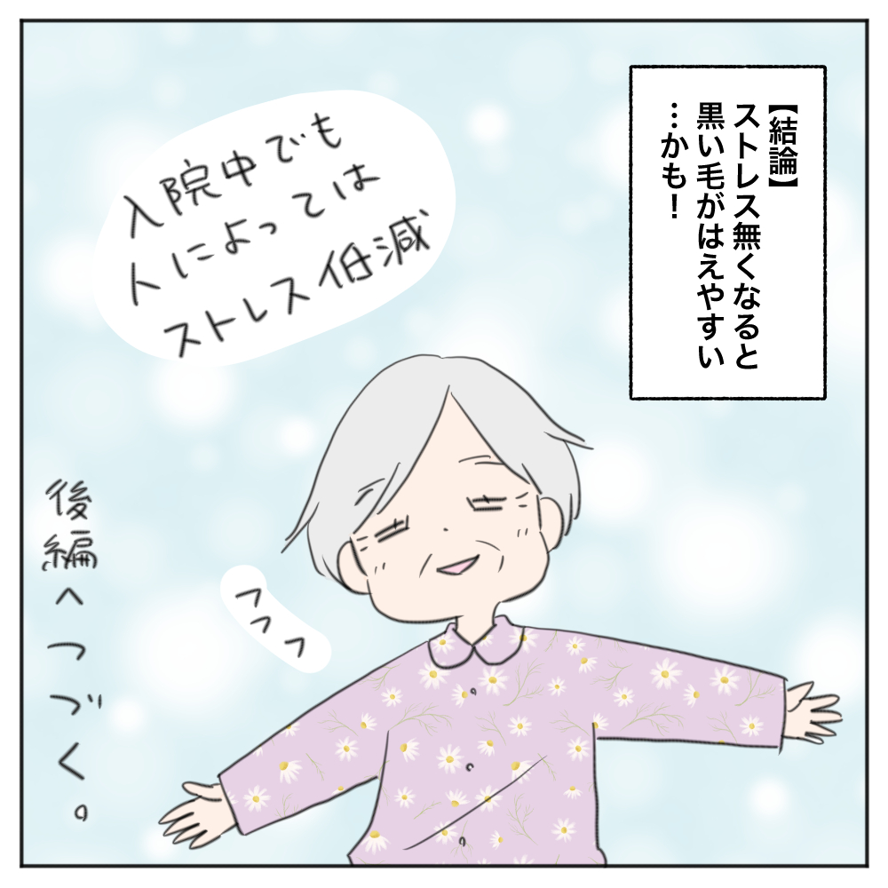 リハビリ病院に入院してから、家事しなくていいからストレスフリーだしさらに黒い髪の毛まで生えてきちゃったというお話は、女性の方数名から聞く機会があって(私調べ)、「家事ストレスって重いんだな、とにかくラクにしていこう!」と気持ちを新たにした20代の頃の私でした…!