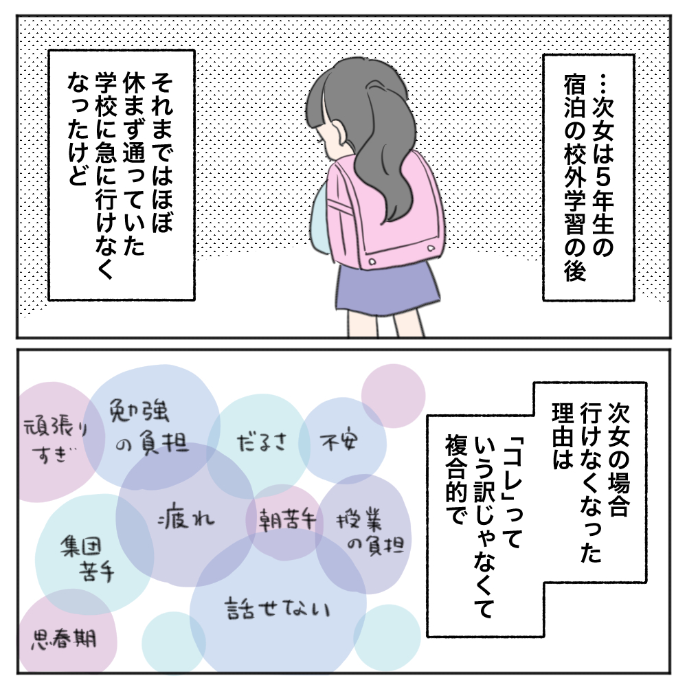 学校に行けなくなる理由は千差万別ですが、我が家の次女の場合は、不登校の理由はコレっていうものはなくて、色々積み重なった結果なんだろうなーという感じでした。