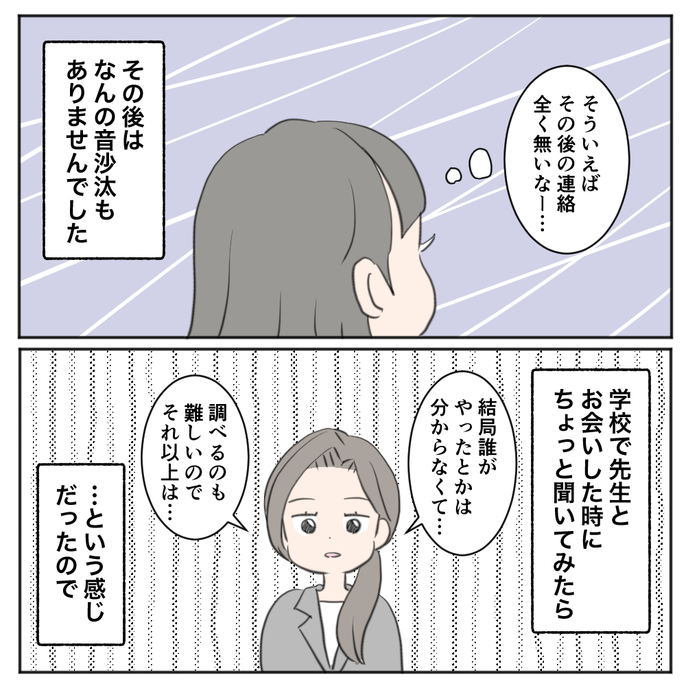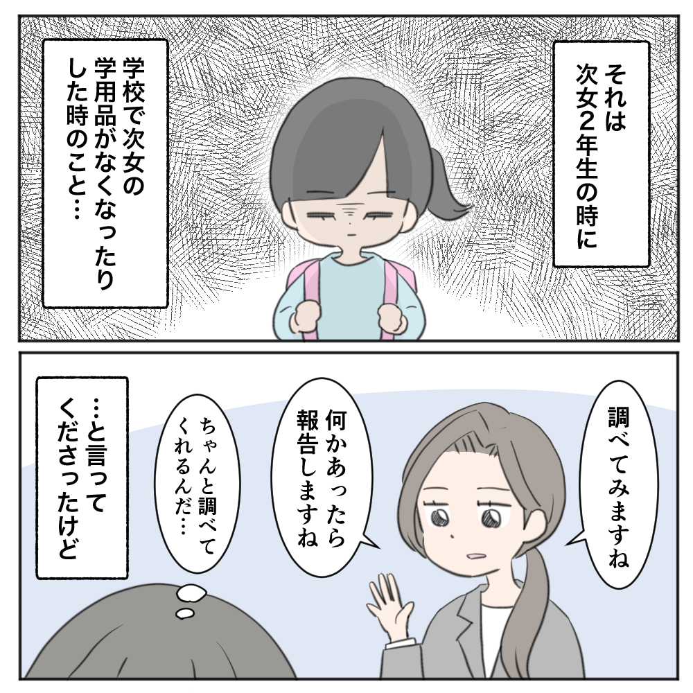 以前、色々あった(物がなくなる、トイレに捨ててあるなど)時の担任の先生の対応は、最初の報告が1回しっかりあったものの、その後は特に何も報告等無かったので、児童間のトラブル?に関する学校の対応はそんな感じなのか…という感じでした。
