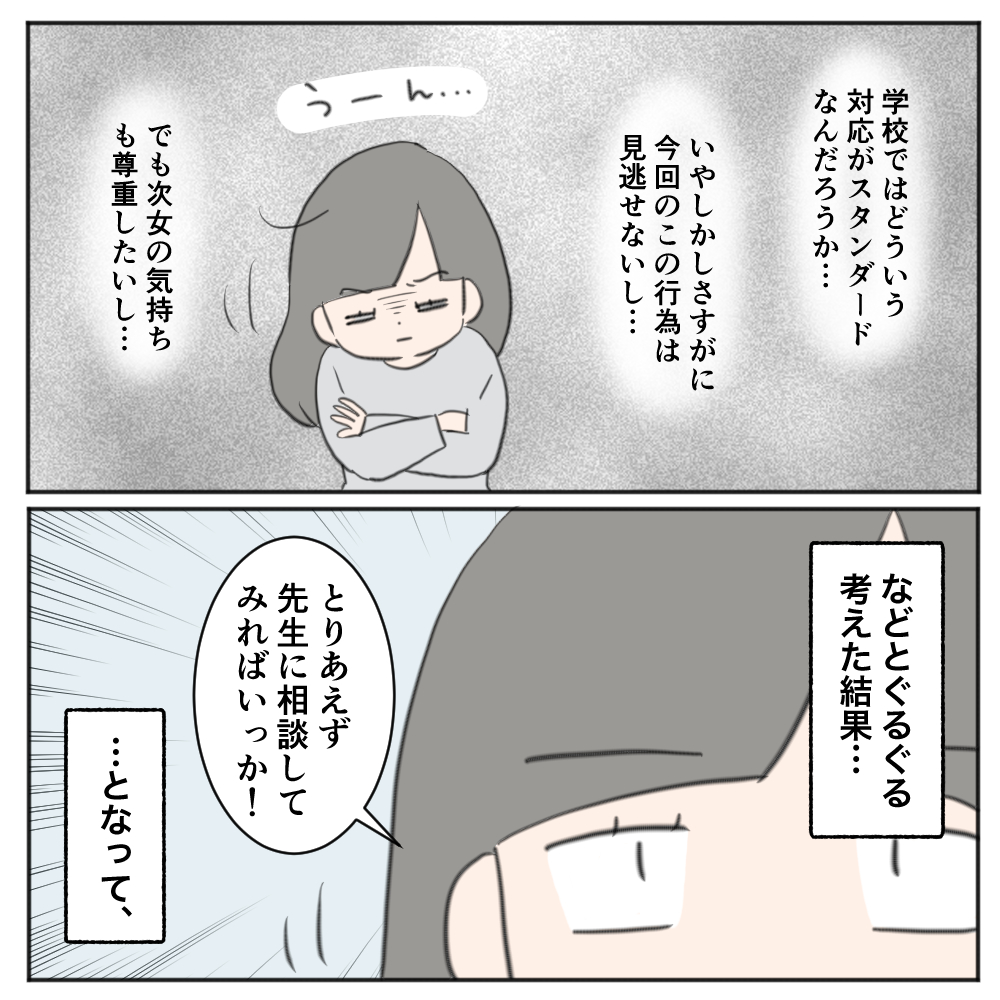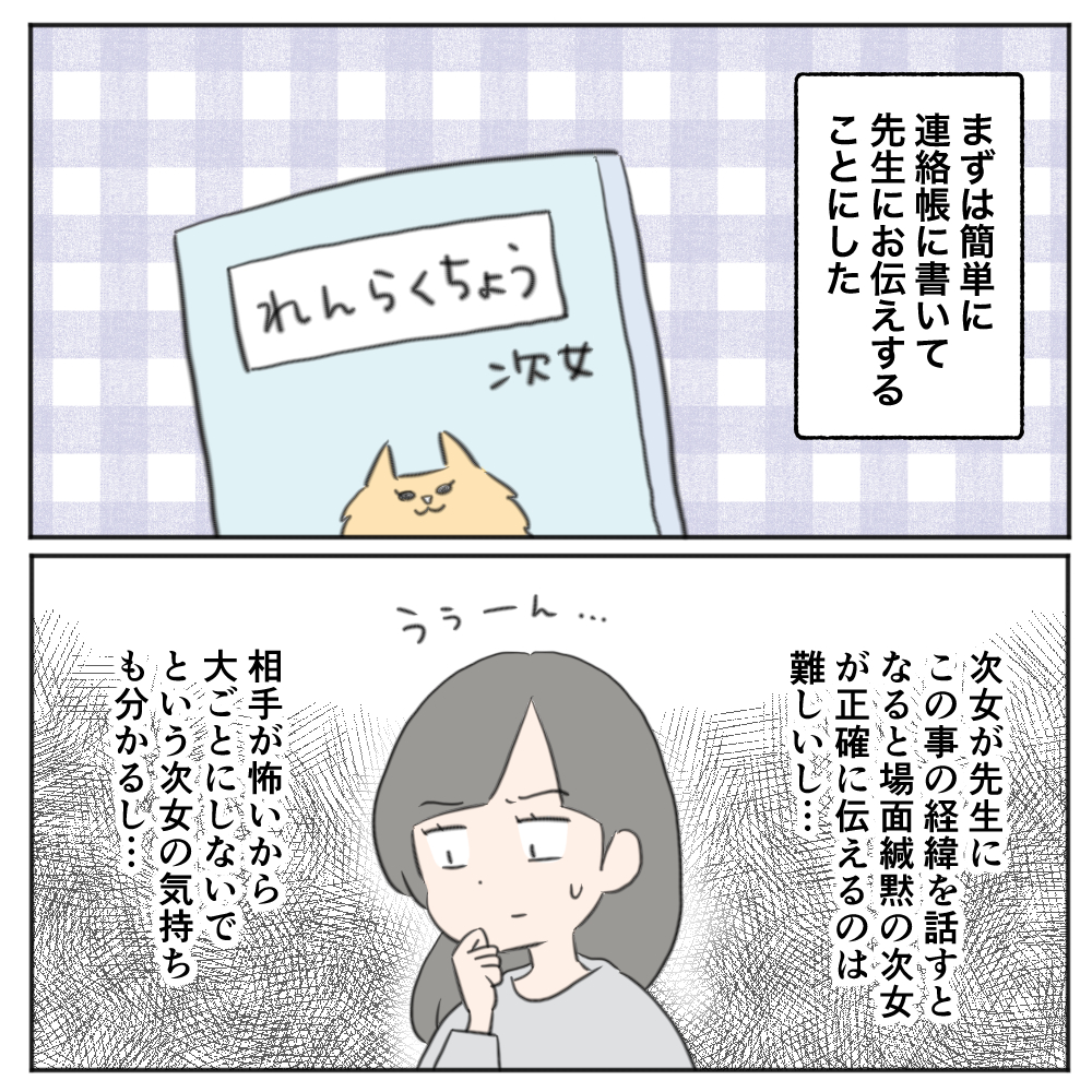 この時は、それと比べると、怪我につながるような加害(怪我をさせる意図は無かったようですが)で危険だし、とりあえずどうしたら良いか分からず、学校に相談してみることにしました。