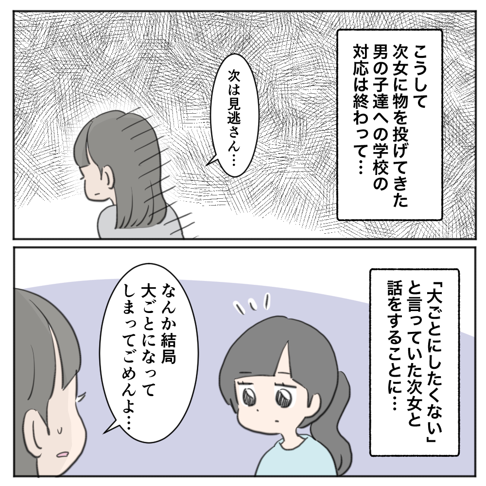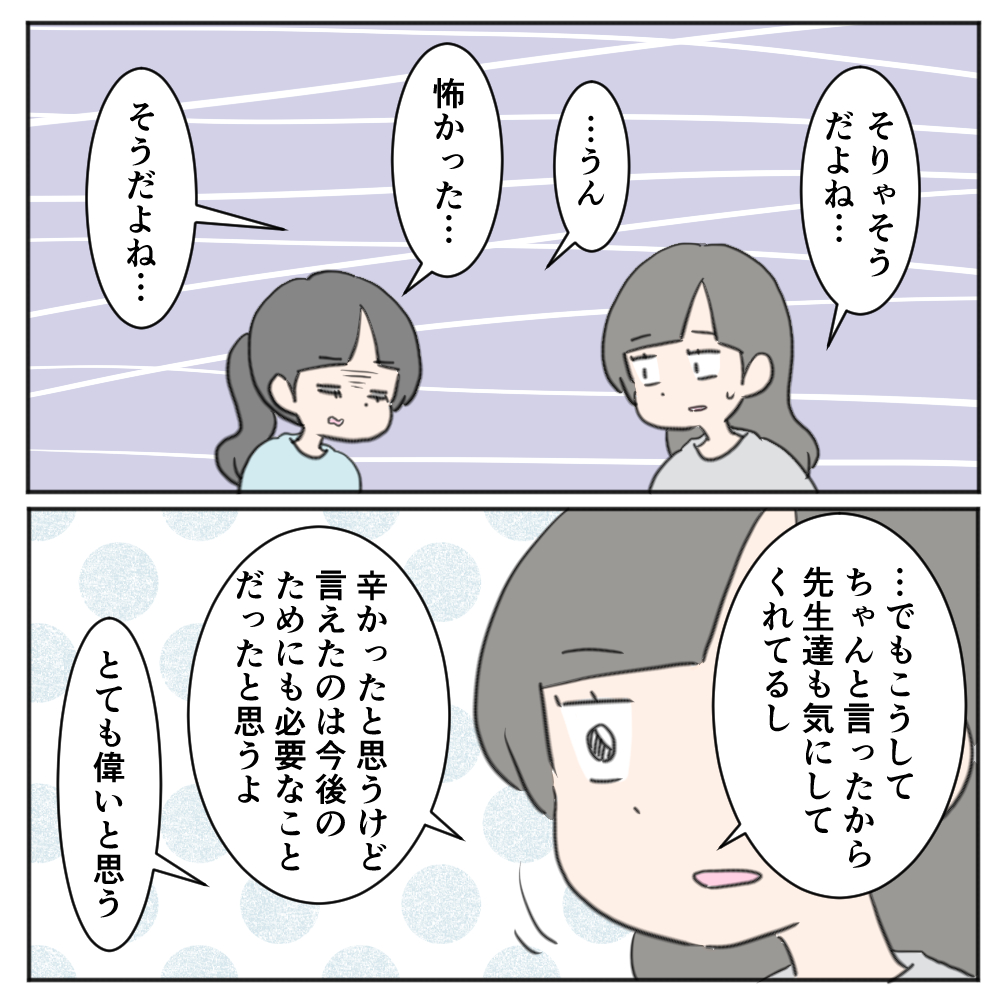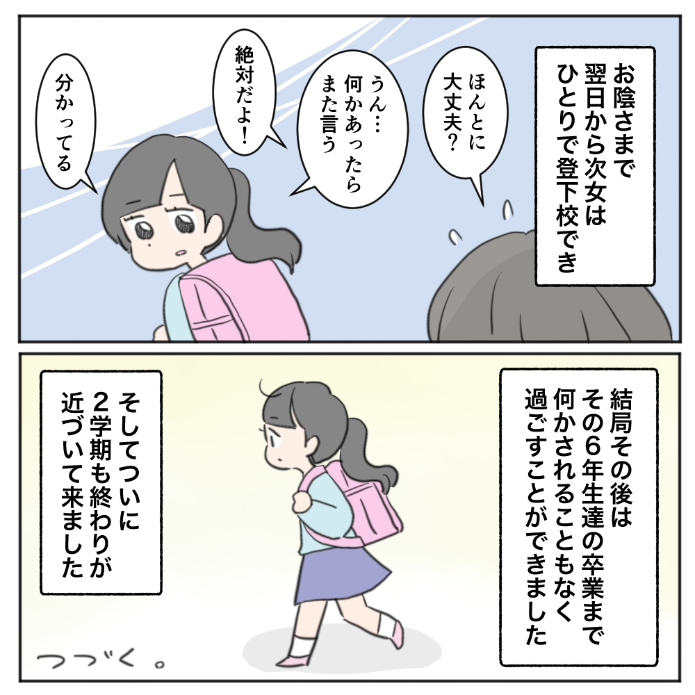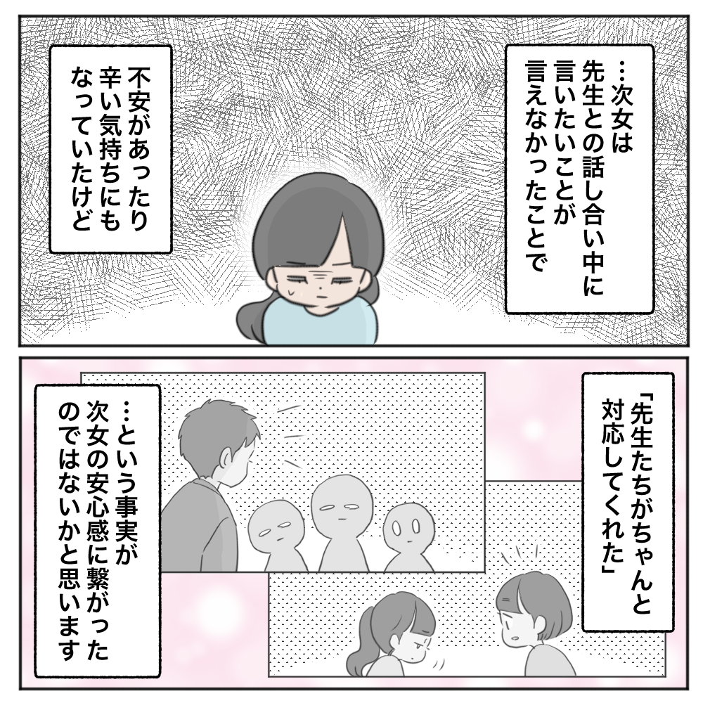 次女は、かなり怖かったり辛かったりしたようですが、それを私にちゃんと言葉で吐き出せたことや、先生方が迅速にちゃんと対応してくれたことで、その後の気持ちの持ち直しが早かったのではないかと思っています。