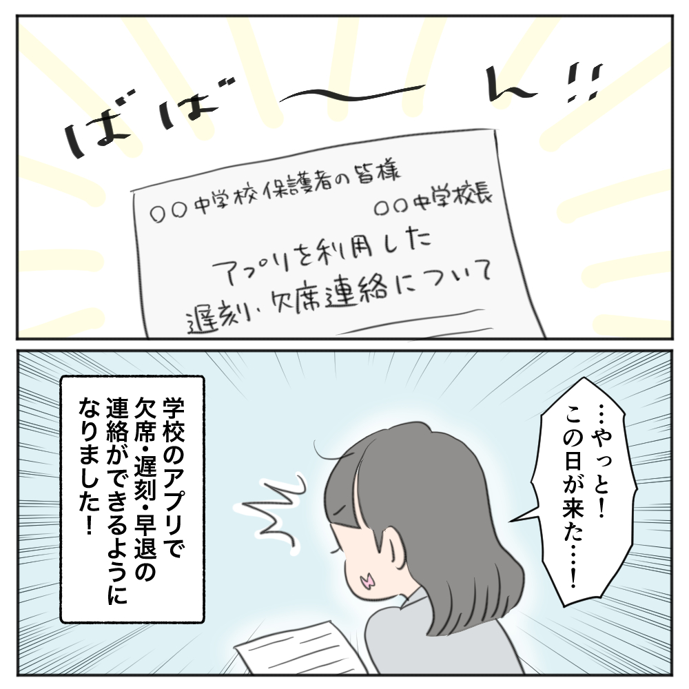 それまでも、学校のお便りなどはアプリの方に来ていたのですが、何故か欠席連絡だけは連絡帳(←近所の子に持って行ってもらう)か、どうしてもの場合は電話でという感じでした…。
