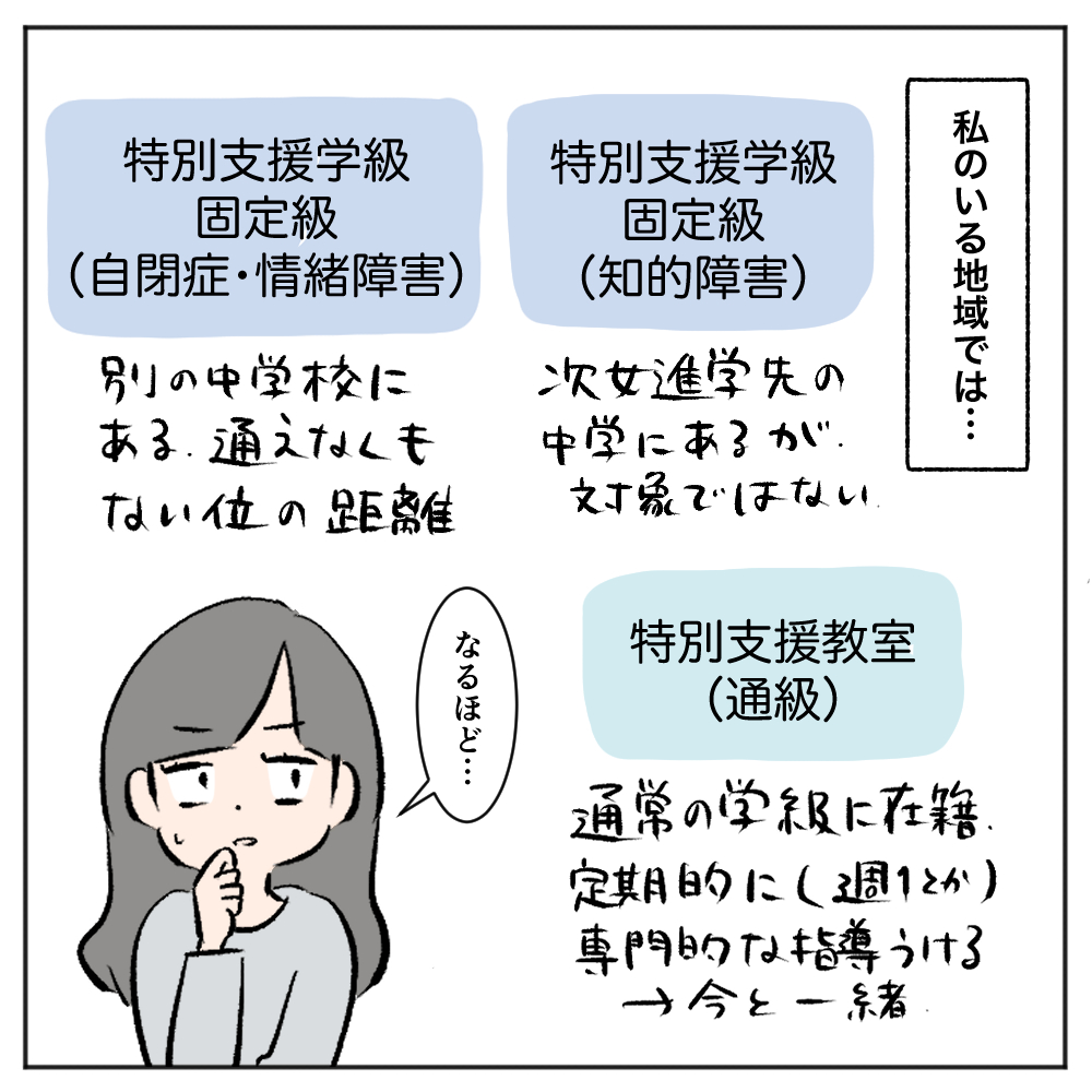 特別支援学級固定級(自閉症・情緒障害)がある中学校はほんっとうに少ないのですが、我が家の場合、送迎は必要だけどなんとか通える範囲にはある…という感じでした。
